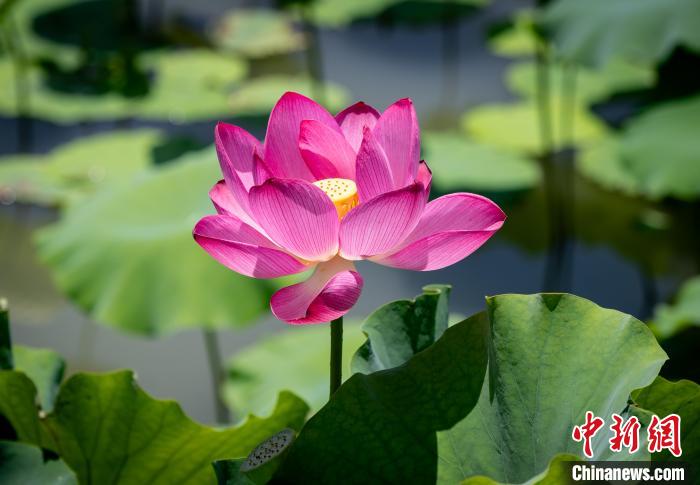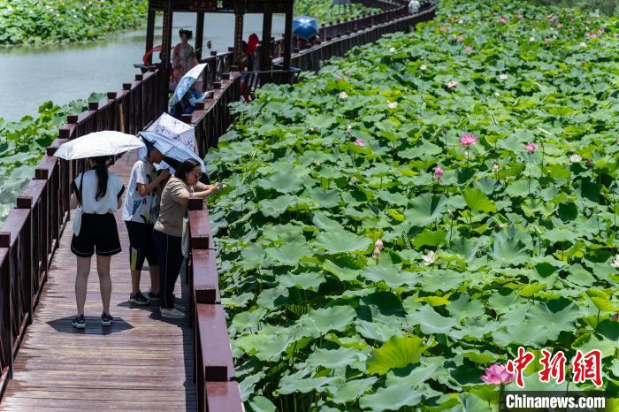 6月15日,位于四川省成都市新津區(qū)千畝荷塘內(nèi)的荷花競相盛開,吸引眾多游客前來游玩賞花。圖為游客拍攝盛開的荷花。韓金雨 攝