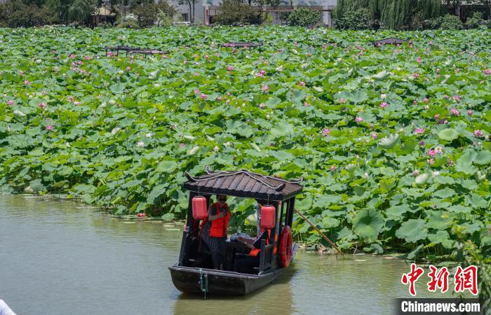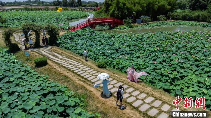 圖為游客身穿漢服在盛開的荷花邊拍照。(無人機(jī)照片)韓金雨 攝