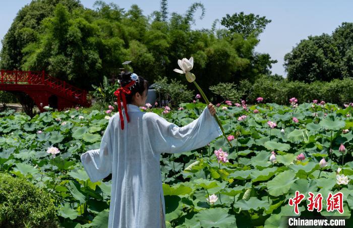 圖為游客身穿漢服在盛開的荷花邊拍照。韓金雨 攝