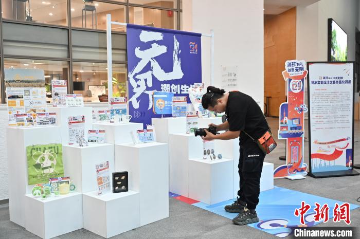 6月18日,琶洲文創(chuàng)設(shè)計(jì)大賽作品快閃展在廣東省廣州藝術(shù)博物院(廣州美術(shù)館)展出。圖為展覽吸引工作人員拍攝。中新社記者 陳楚紅 攝