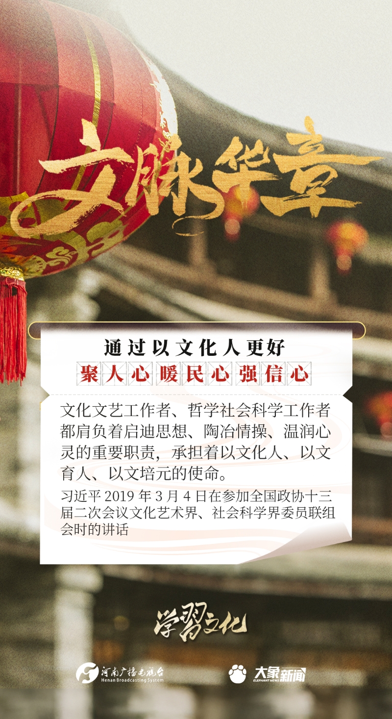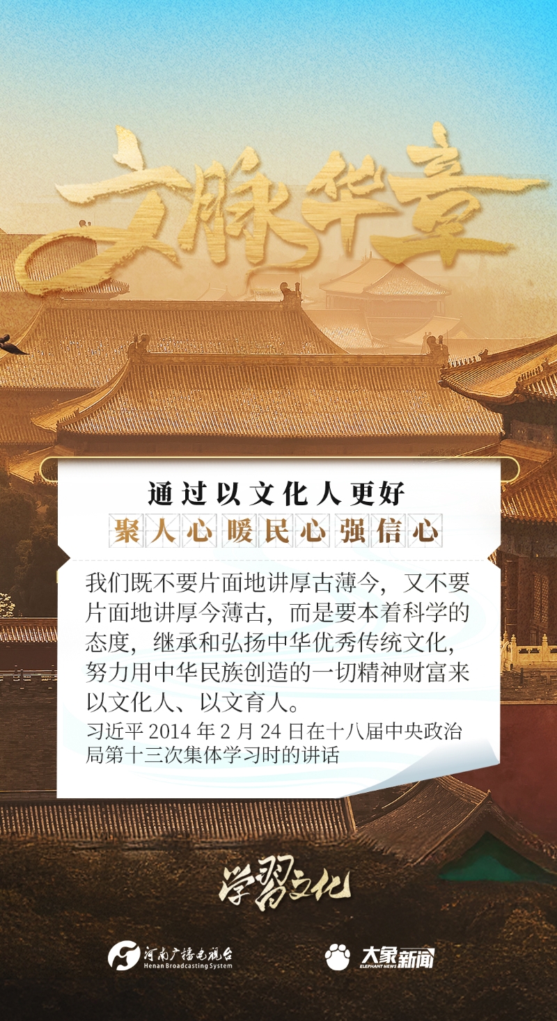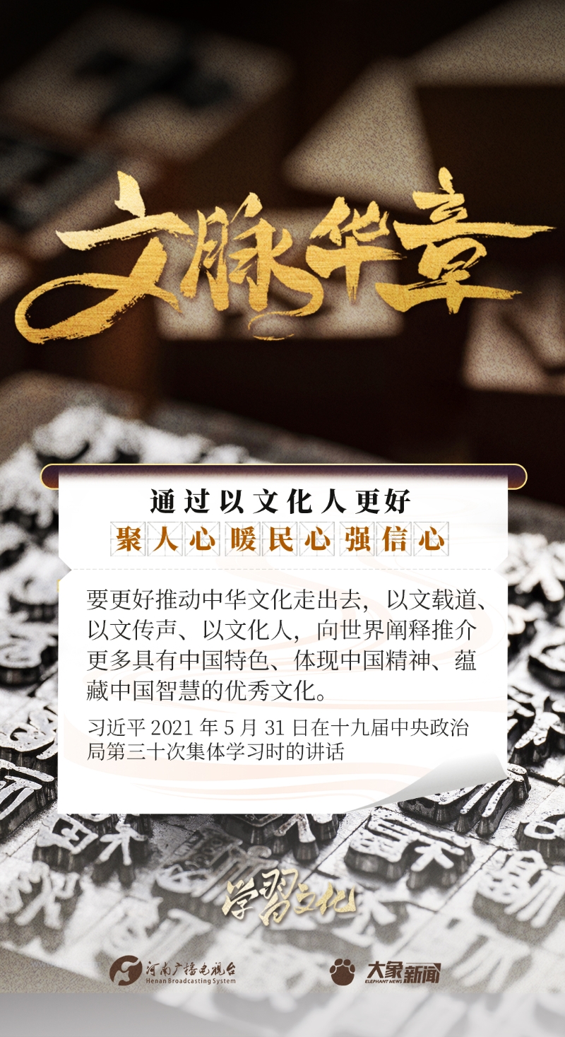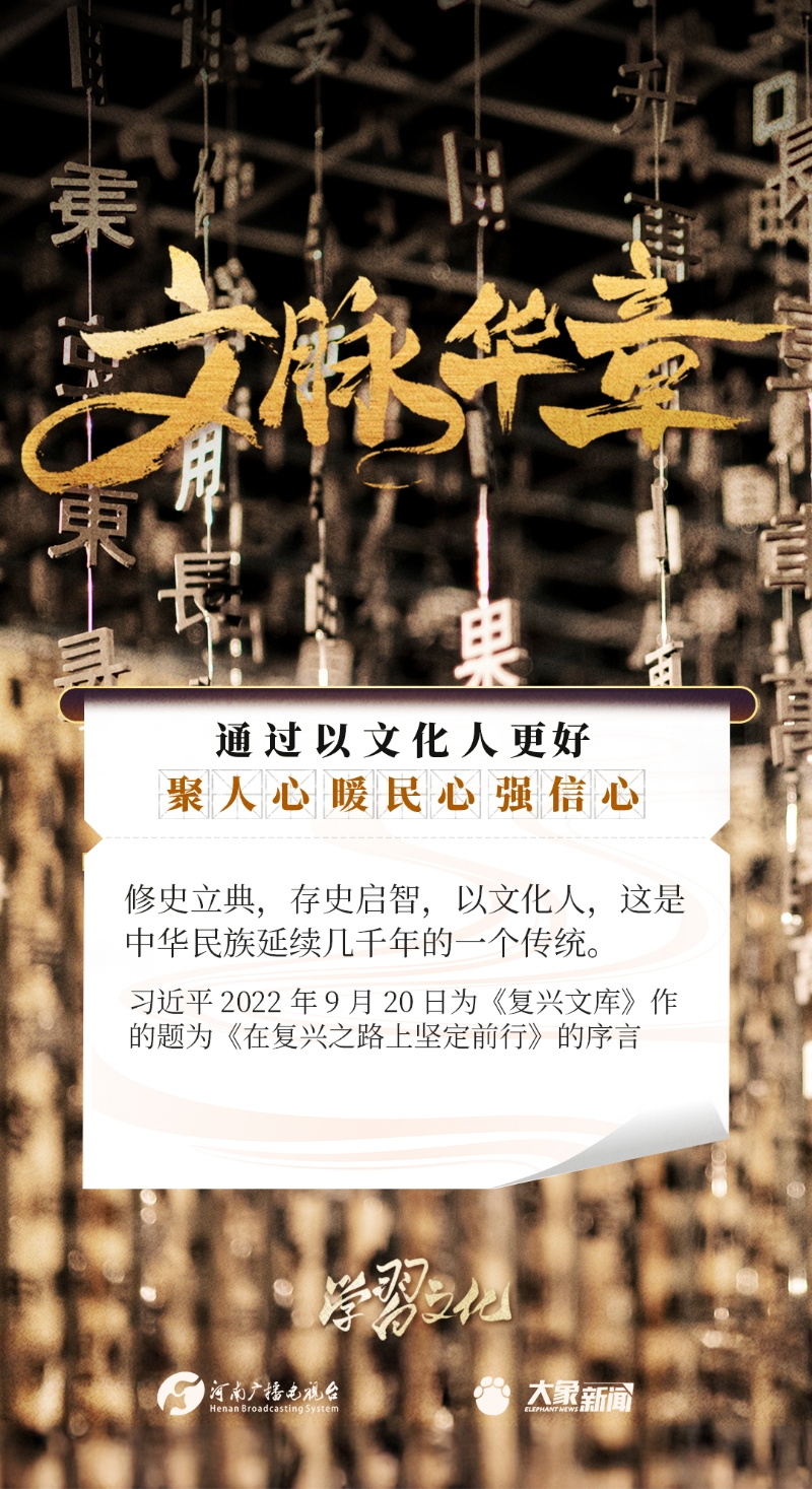以文化人,是中華民族延續(xù)幾千年的一個(gè)傳統(tǒng),也是增強(qiáng)民族凝聚力、民族自豪感的重要依托。習(xí)近平總書記一貫倡導(dǎo)以文化人,激發(fā)廣大干部群眾改革創(chuàng)新、振興發(fā)展的激情和斗志,發(fā)表了一系列重要講話,大象新聞邀您一起學(xué)思踐悟。