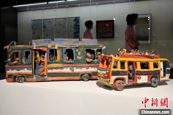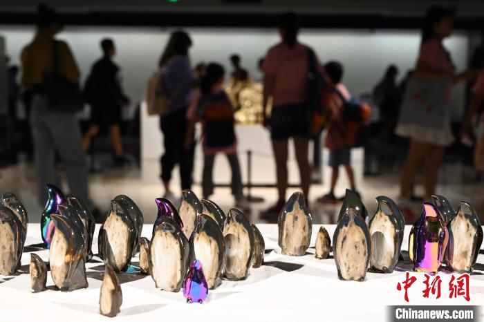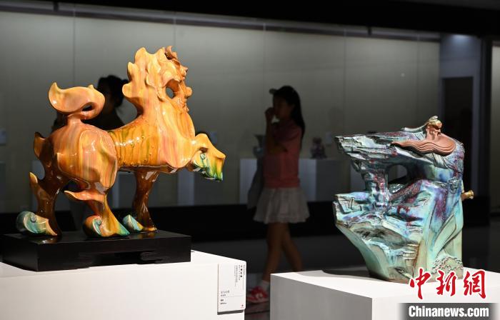 7月15日,內蒙古呼和浩特市,民眾關注陶瓷作品《它》(右)。中新社記者 劉文華 攝