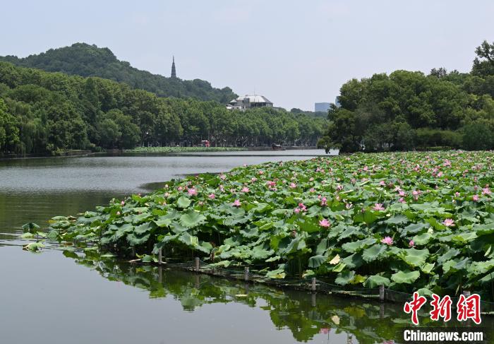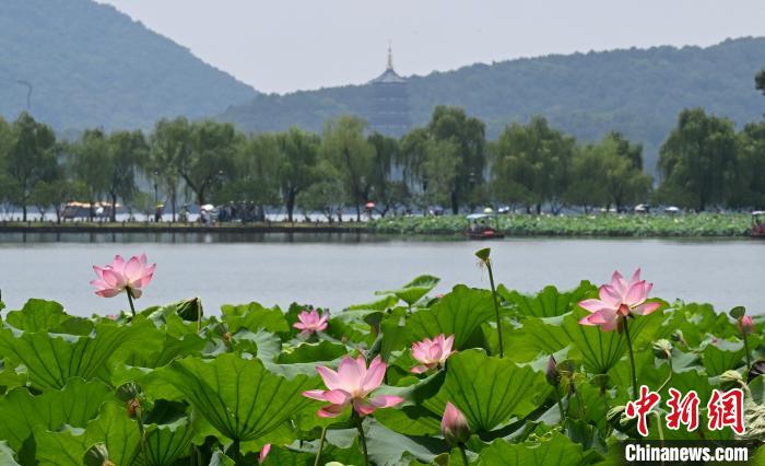 7月17日,西湖群山前荷花次第開放。近日,浙江杭州西湖景區(qū)百余畝荷花迎來盛花期,“映日荷花別樣紅”的夏日美景吸引游客。中新社記者 王剛 攝