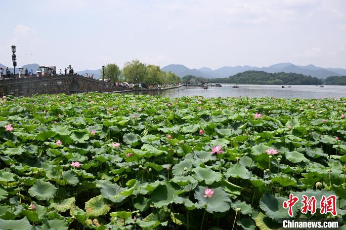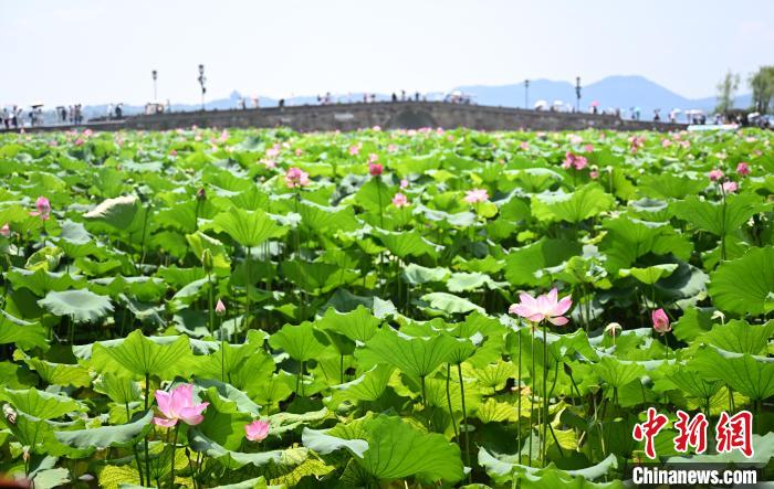 7月17日,斷橋荷塘內(nèi)荷花盛放。近日,浙江杭州西湖景區(qū)百余畝荷花迎來盛花期,“映日荷花別樣紅”的夏日美景吸引游客。中新社記者 王剛 攝