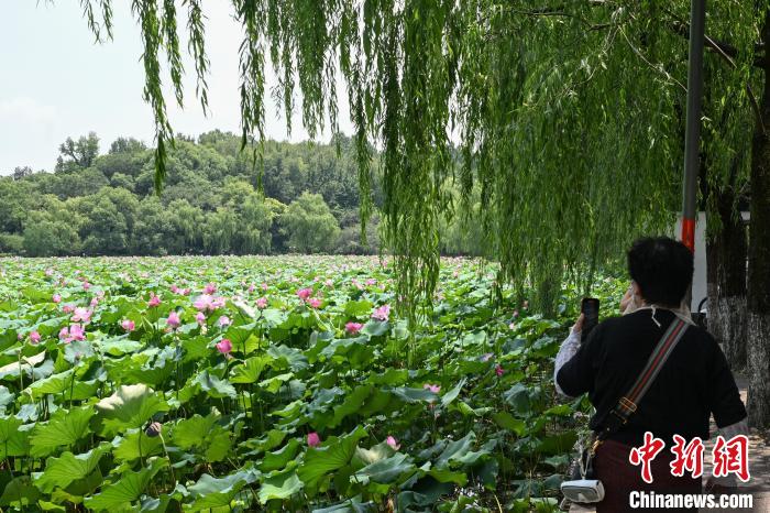 7月17日,游客在西湖后孤山拍攝荷花。近日,浙江杭州西湖景區(qū)百余畝荷花迎來盛花期,“映日荷花別樣紅”的夏日美景吸引游客。中新社記者 王剛 攝