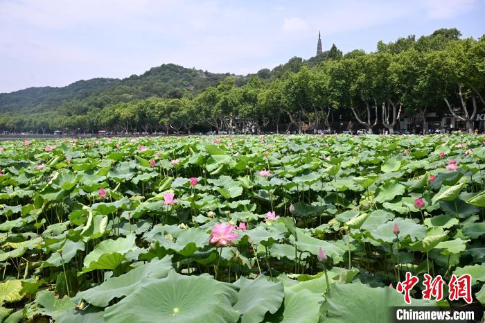 7月17日,西湖雷峰塔、白堤前荷花盛放。近日,浙江杭州西湖景區(qū)百余畝荷花迎來盛花期,“映日荷花別樣紅”的夏日美景吸引游客。中新社記者 王剛 攝
