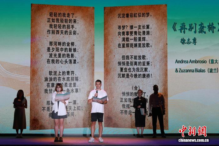 7月19日,海外留學(xué)生朗誦中國(guó)詩(shī)歌《再別康橋》。當(dāng)晚,“秀山麗水·飛越夢(mèng)想”國(guó)際詩(shī)會(huì)在浙江麗水舉行,來(lái)自海內(nèi)外的留學(xué)生、華僑代表及文藝工作者相聚一堂,以中外經(jīng)典詩(shī)篇朗誦為核心,融入歌舞演繹、民族服飾走秀、器樂(lè)合奏和非遺技藝展示等多元形式,誦經(jīng)典、展風(fēng)采、傳文化。孫楊洋 攝