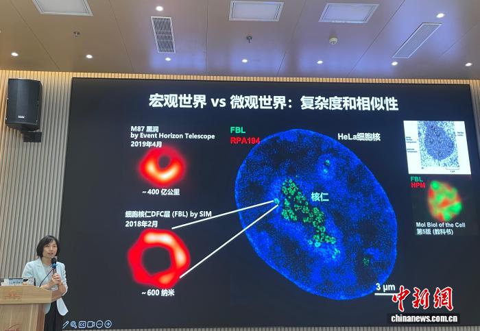 中國(guó)科學(xué)院分子細(xì)胞科學(xué)卓越創(chuàng)新中心研究員陳玲玲24日在上海接受采訪(fǎng)時(shí)展示了一組照片,一張是事件視界望遠(yuǎn)鏡(EHT)于2019年4月發(fā)布的人類(lèi)首張黑洞照片——M87黑洞,該黑洞事件視界直徑為400億公里;另一張是2018年2月,陳玲玲團(tuán)隊(duì)拍攝到的細(xì)胞核仁DFC(致密纖維組分)層圖像,其直徑為600納米。