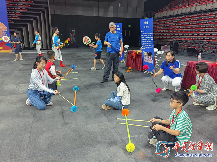 在乒乓球交流賽現(xiàn)場,還進行了空竹、彩帶龍、太極拳、霸王鞭、太平鼓、打花棍等非遺項目展演,引起了小臺胞們的極大興趣,紛紛參與學習與體驗,認真聽老師講解,玩得不亦樂乎。