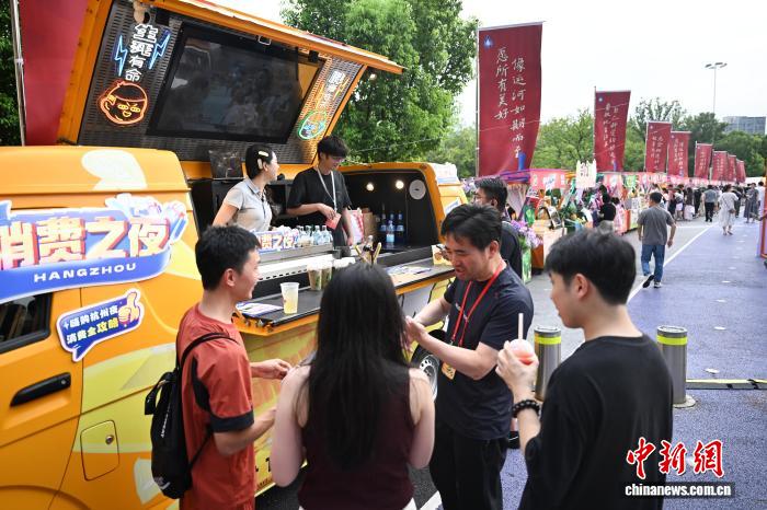 7月27日,市民進入"浙BA·運河潮"活力市集。近日,浙江省城市籃球聯(lián)賽(浙BA)杭州賽區(qū)半決賽、決賽陸續(xù)舉辦,民眾觀賽熱情高漲。當?shù)亟枇@球運動熱,打造“票根經(jīng)濟”“特色市集”等,帶動相關消費。中新社記者 王剛 攝