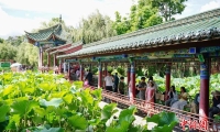 7月28日,演員在航站樓出發(fā)公共區(qū)域表演,并與游客互動合影。中新社記者 殷立勤 攝