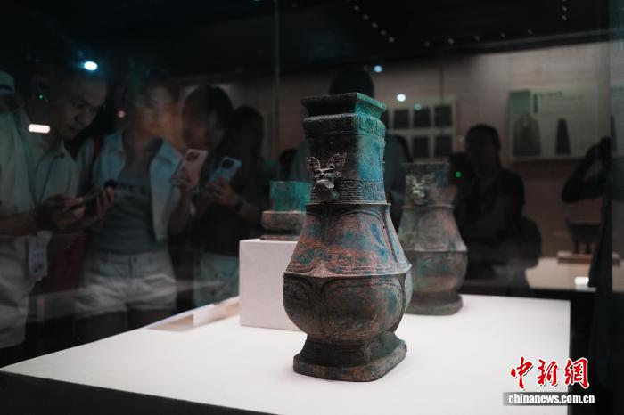 8月6日,河南安陽,參加“穿越古今 漢你相‘豫’”河南古都創(chuàng)享之旅的數十位臺灣網絡達人、自媒體從業(yè)者等在中國文字博物館尋找漢字根源。圖為西周賈伯壺吸引臺灣網絡達人圍觀。中新社記者 闞力 攝