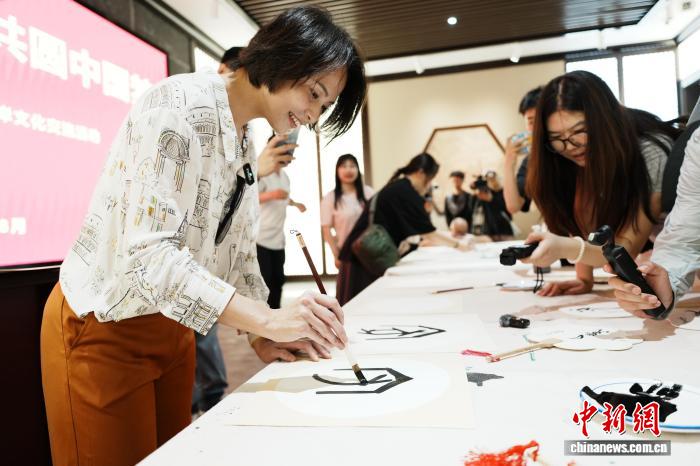8月6日,河南安陽,參加“穿越古今 漢你相‘豫’”河南古都創(chuàng)享之旅的數十位臺灣網絡達人、自媒體從業(yè)者等在中國文字博物館尋找漢字根源。圖為臺灣網絡達人模仿書寫甲骨文。中新社記者 闞力 攝