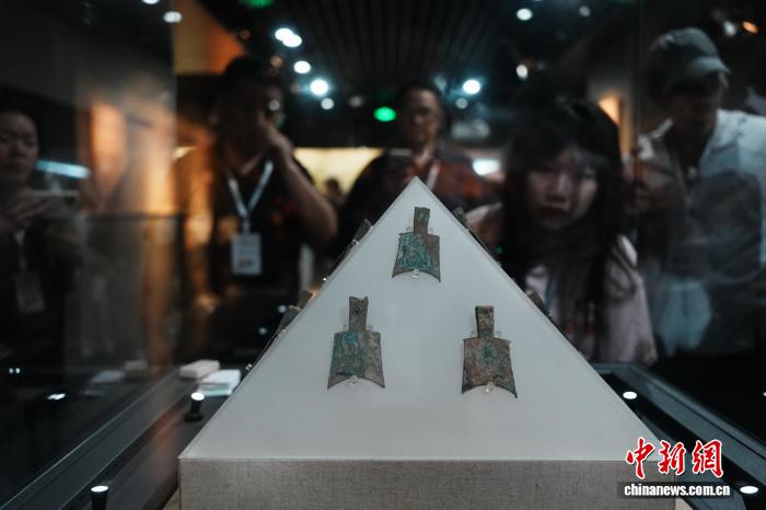 8月6日,河南安陽,參加“穿越古今 漢你相‘豫’”河南古都創(chuàng)享之旅的數十位臺灣網絡達人、自媒體從業(yè)者等在中國文字博物館尋找漢字根源。圖為臺灣網絡達人圍觀館藏戰(zhàn)國布幣。中新社記者 闞力 攝