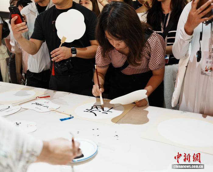 8月6日,河南安陽,參加“穿越古今 漢你相‘豫’”河南古都創(chuàng)享之旅的數十位臺灣網絡達人、自媒體從業(yè)者等在中國文字博物館尋找漢字根源。圖為臺灣網絡達人嘗試書寫甲骨文。中新社記者 闞力 攝