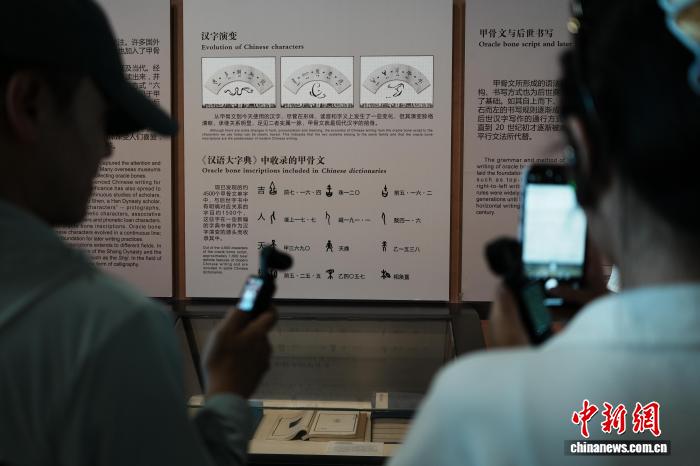 8月6日,河南安陽,參加“穿越古今 漢你相‘豫’”河南古都創(chuàng)享之旅的數十位臺灣網絡達人、自媒體從業(yè)者等在中國文字博物館尋找漢字根源。圖為臺灣網絡達人欣賞甲骨文。中新社記者 闞力 攝
