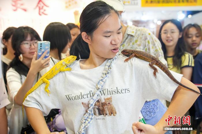 8月9日,正在廣西南寧國際會展中心舉行的寵物展吸引不少參觀者。圖為參觀者將兩只鬃獅蜥放在肩膀上。中新社記者 陳冠言 攝