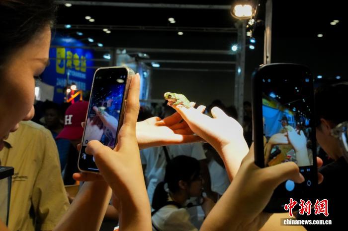 8月9日,正在廣西南寧國際會展中心舉行的寵物展吸引不少參觀者。圖為參觀者手捧一只樹蛙拍照。中新社記者 陳冠言 攝
