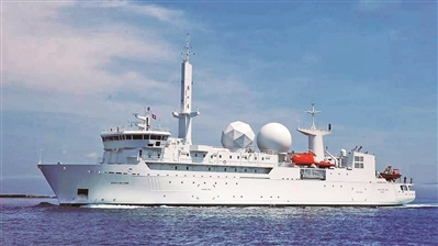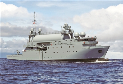 信號(hào)情報(bào)船,又稱電子偵察船,是海軍重要的情報(bào)支援平臺(tái),主要用于在不暴露己方意圖的前提下,通過搜集、分析對方各類電磁信號(hào)(包括雷達(dá)、通信、聲吶等)為作戰(zhàn)指揮提供關(guān)鍵情報(bào)支持。在封閉海域執(zhí)行任務(wù)的信號(hào)情報(bào)船通常采用中型設(shè)計(jì),船長約100米,滿載排水量3000至4000噸,最大航速20節(jié)左右。這類艦船配有多型高靈敏度電子偵察設(shè)備,其中全頻譜電子支援系統(tǒng)是其核心裝備,可實(shí)現(xiàn)對低頻至極高頻范圍內(nèi)所有信號(hào)的偵收。