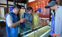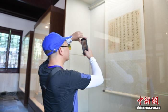 8月18日,2025“青春同行”兩岸新媒體創(chuàng)享季安徽交流營活動在馬鞍山啟幕。近二十位兩岸自媒體人走進馬鞍山、宣城,開啟為期五天的尋跡詩仙李白之旅。圖為自媒體人在馬鞍山市長江采石磯文化生態(tài)旅游區(qū)參觀李白書法。中新社記者 儲瑋瑋 攝