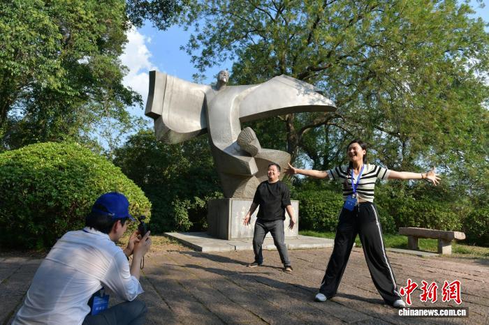 8月18日,2025“青春同行”兩岸新媒體創(chuàng)享季安徽交流營活動在馬鞍山啟幕。近二十位兩岸自媒體人走進馬鞍山、宣城,開啟為期五天的尋跡詩仙李白之旅。圖為自媒體人在馬鞍山市長江采石磯文化生態(tài)旅游區(qū)打卡李白雕像。中新社記者 儲瑋瑋 攝