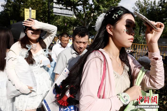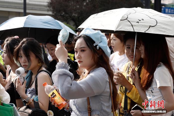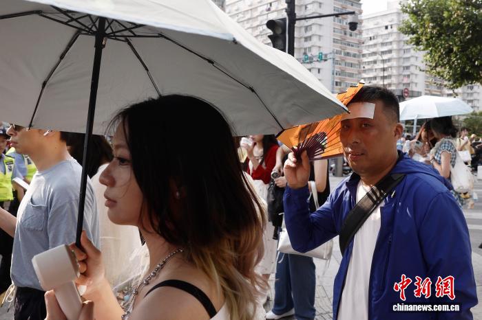 8月24日,游客一邊貼著冰寶貼、一邊用扇子遮陽行走在漕溪北路街頭。中新社記者 殷立勤 攝