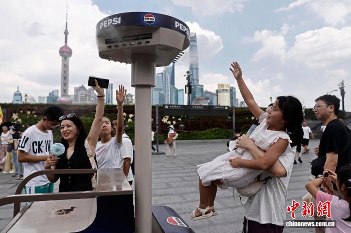 8月24日,游客在南京東路步行街上的噴霧降溫裝置下避暑。中新社記者 殷立勤 攝