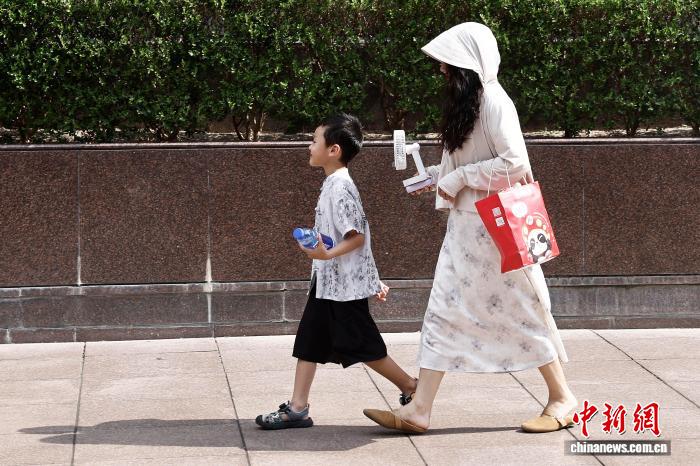 8月24日,在南京東路步行街上,家長手持電風(fēng)扇給孩子降溫。中新社記者 殷立勤 攝