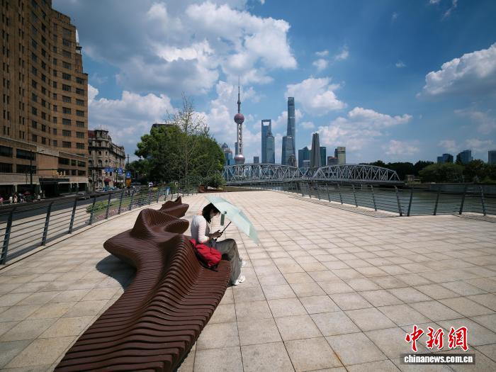 8月24日,游客打著遮陽傘在北蘇州路上休息。中新社記者 殷立勤 攝