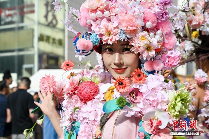 8月27日,模特在昆明市街頭展示人體花藝。中新社記者 李嘉嫻 攝