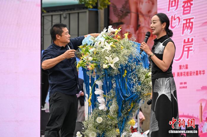 8月27日,臺(tái)灣資深花藝師周宇凱(左)現(xiàn)場(chǎng)制作花藝作品。中新社記者 李嘉嫻 攝