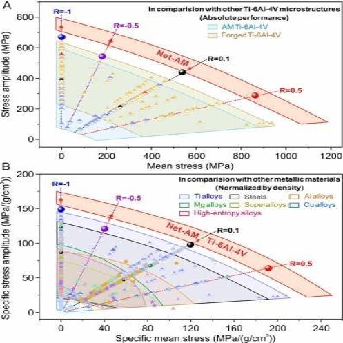2024年初,研究團(tuán)隊(duì)發(fā)明一種凈增材制造(Net-AM preparation,NAMP)的新工藝,能精確控制材料的內(nèi)部結(jié)構(gòu)和缺陷,用新工藝制備的Ti-6Al-4V(一種最常用的鈦合金)可同時(shí)消除微孔和粗大組織——兩者都是導(dǎo)致疲勞的元兇。這種新材料在循環(huán)“拉-拉”應(yīng)力條件下,打破了“比疲勞強(qiáng)度”(強(qiáng)度除以密度,是衡量輕質(zhì)材料性能的關(guān)鍵指標(biāo))世界紀(jì)錄,證明3D打印材料也能擁有頂級的抗疲勞能力。