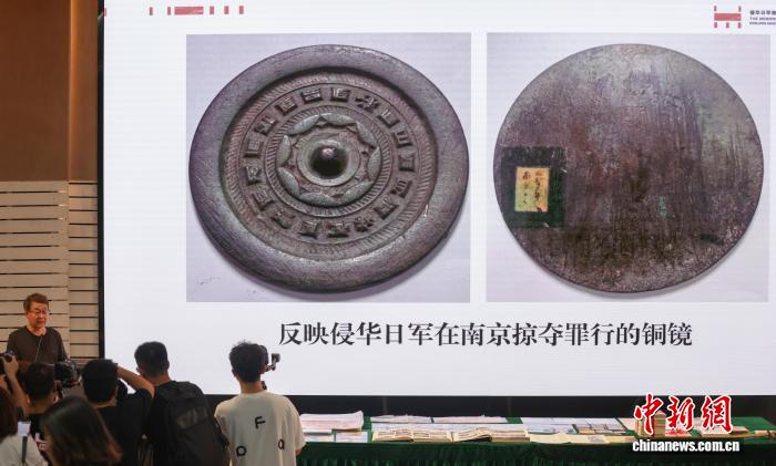 9月2日,江蘇南京,捐贈(zèng)人介紹捐贈(zèng)給侵華日軍南京大屠殺遇難同胞紀(jì)念館的“反映侵華日軍在南京掠奪罪行的銅鏡”。當(dāng)日,侵華日軍南京大屠殺遇難同胞紀(jì)念館舉行文物史料捐贈(zèng)儀式,百余件文物史料入藏該紀(jì)念館,這當(dāng)中有揭露侵華日軍暴行的英美報(bào)刊、反映中國(guó)人民抗日戰(zhàn)爭(zhēng)暨世界反法西斯戰(zhàn)爭(zhēng)勝利的紀(jì)念信封、新四軍游擊隊(duì)繳獲的日軍軍刀等。中新社記者 泱波 攝