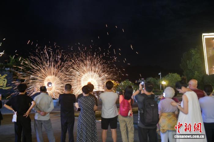9月10日,在安徽省黃山市休寧縣齊云山生態(tài)文化旅游度假區(qū),游客正在觀賞打鐵花表演。中新社記者 儲瑋瑋 攝