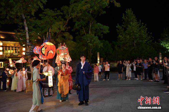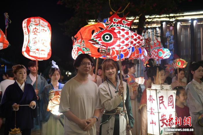 9月10日,在安徽省黃山市休寧縣齊云山生態(tài)文化旅游度假區(qū),魚燈巡游隊(duì)伍吸引游客駐足。中新社記者 儲瑋瑋 攝
