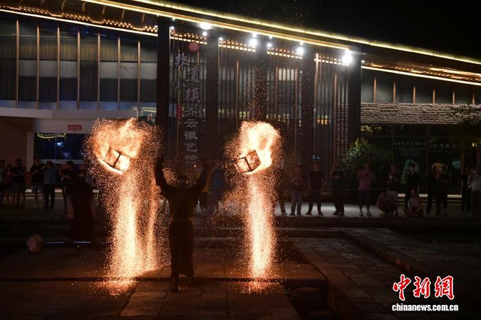 9月10日,在安徽省黃山市休寧縣齊云山生態(tài)文化旅游度假區(qū),游客正在觀賞火壺表演。中新社記者 儲瑋瑋 攝