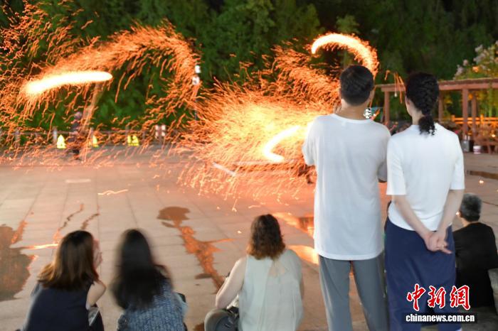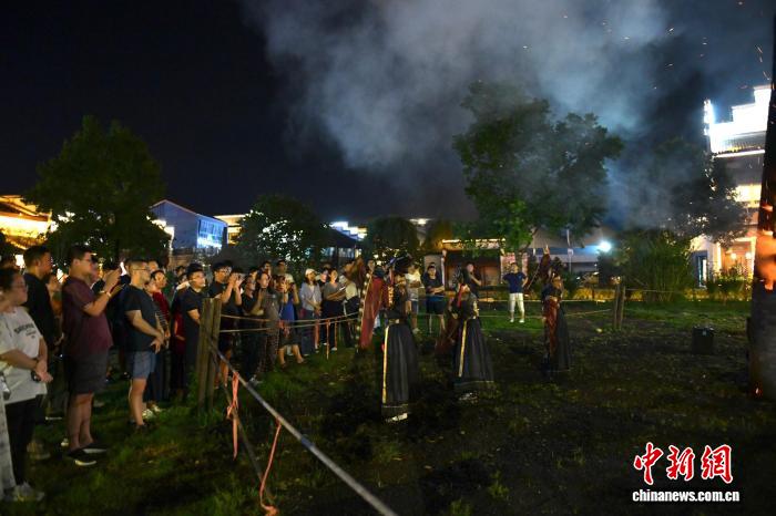 9月10日,在安徽省黃山市休寧縣齊云山生態(tài)文化旅游度假區(qū),游客正在觀賞炭花舞表演。中新社記者 儲瑋瑋 攝