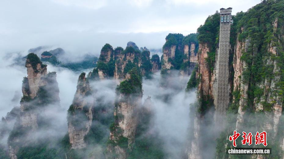 9月15日,湖南張家界武陵源在一場(chǎng)秋雨后迎來(lái)放晴,張家界國(guó)家森林公園內(nèi)的多個(gè)景區(qū)“上新”絕美云海景觀,其夢(mèng)幻意境勝過(guò)《阿凡達(dá)》中的懸浮仙境,讓海內(nèi)外游客直呼“不虛此行”。圖為云霧纏繞的百龍?zhí)焯荨?/p>