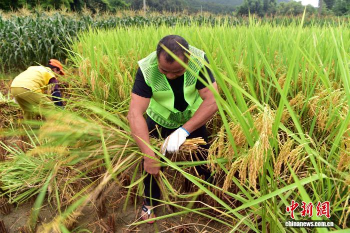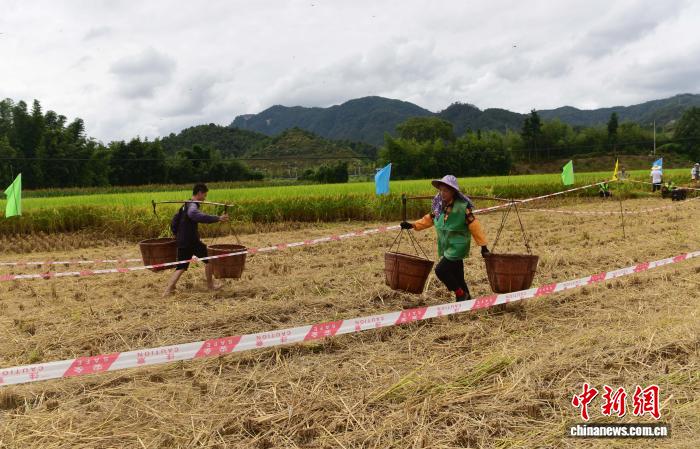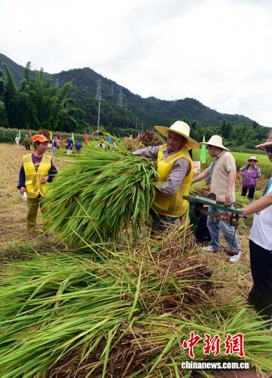圖為割稻比賽當(dāng)場(chǎng)稱重。中新社記者 張麗君 攝