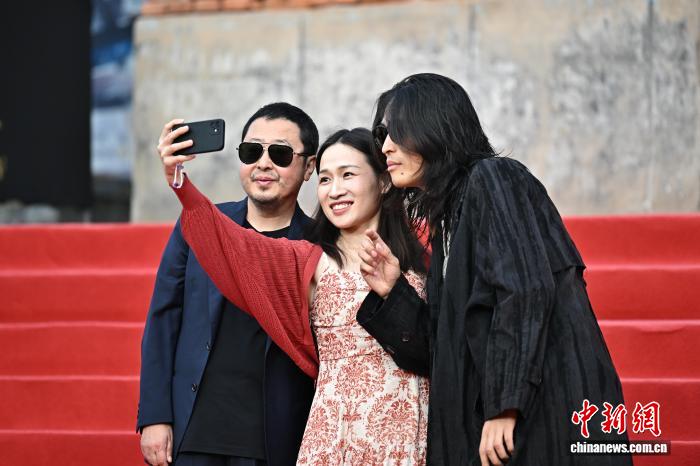 9月29日晚,第九屆平遙國際電影展在山西省晉中市平遙古城舉行閉幕紅毯儀式。圖為青年電影人與導演賈樟柯(左)合影。中新社記者 韋亮 攝
