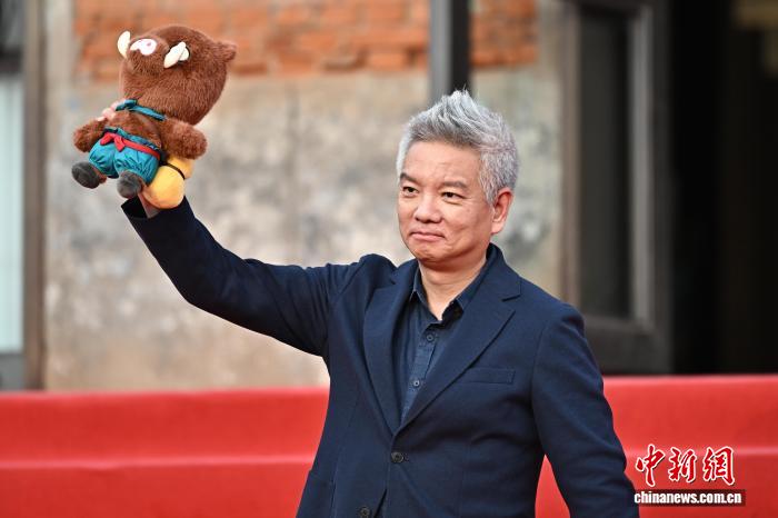 9月29日晚,第九屆平遙國際電影展在山西省晉中市平遙古城舉行閉幕紅毯儀式。圖為《浪浪山小妖怪》監(jiān)制、藝術(shù)總監(jiān)陳廖宇攜“主演”小豬妖亮相紅毯。中新社記者 韋亮 攝