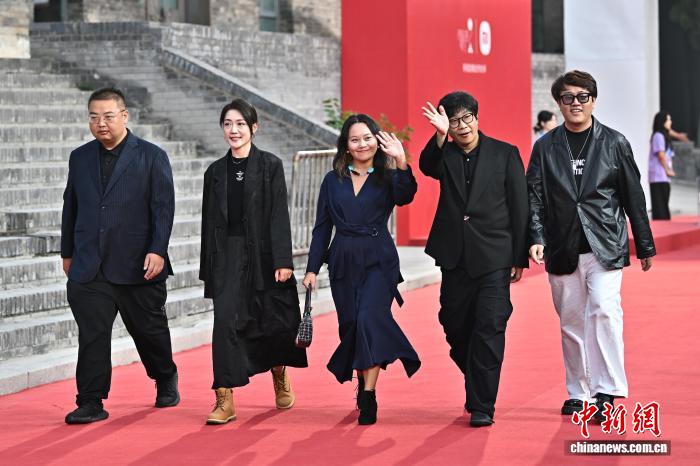 9月29日晚,第九屆平遙國際電影展在山西省晉中市平遙古城舉行閉幕紅毯儀式。圖為香港動畫電影《世外》編劇楊寶文(中)攜主創(chuàng)人員亮相紅毯。中新社記者 韋亮 攝