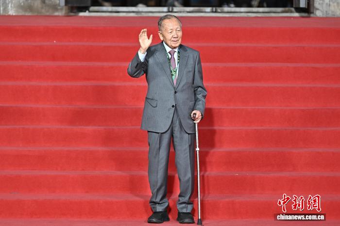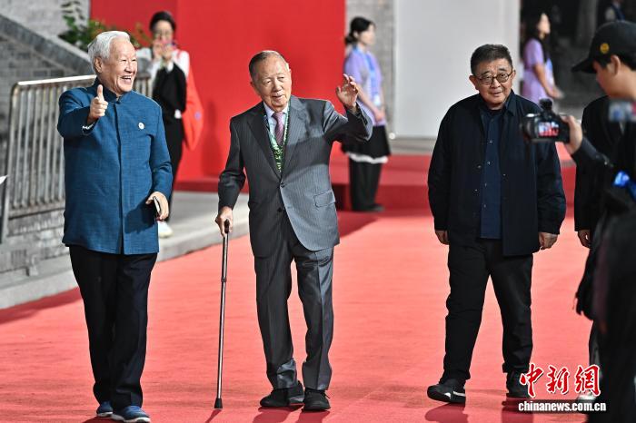 9月29日晚,第九屆平遙國際電影展在山西省晉中市平遙古城舉行閉幕紅毯儀式。圖為導演謝飛(左)、韓國釜山國際電影節(jié)前任主席金東虎(中)亮相紅毯。中新社記者 韋亮 攝