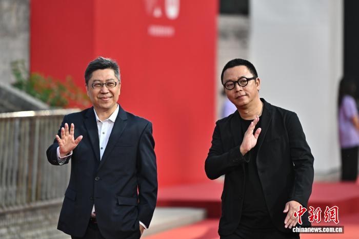9月29日晚,第九屆平遙國際電影展在山西省晉中市平遙古城舉行閉幕紅毯儀式。圖為中國臺灣導演沈可尚(右)、臺灣資深制片人黃茂昌亮相紅毯。中新社記者 韋亮 攝