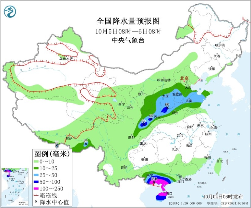 10月5日08時(shí)至6日08時(shí),西藏南部、西北地區(qū)東部、華北中西部和南部、黃淮大部、四川盆地北部及廣東西南部、廣西南部、海南島等地部分地區(qū)有中到大雨,其中,陜西南部、山西南部、四川盆地北部、廣西南部、廣東西南部、海南島等地部分地區(qū)有暴雨或大暴雨(100~240毫米)。新疆北部和東部、甘肅河西、內(nèi)蒙古西部和東部、廣西東南部、廣東南部沿海、海南島北部等地部分地區(qū)有5~7級(jí)風(fēng);渤海將有6~7級(jí)風(fēng)、陣風(fēng)8級(jí),南海西北部、瓊州海峽、北部灣等海域有9~11級(jí)風(fēng),陣風(fēng)12級(jí)。