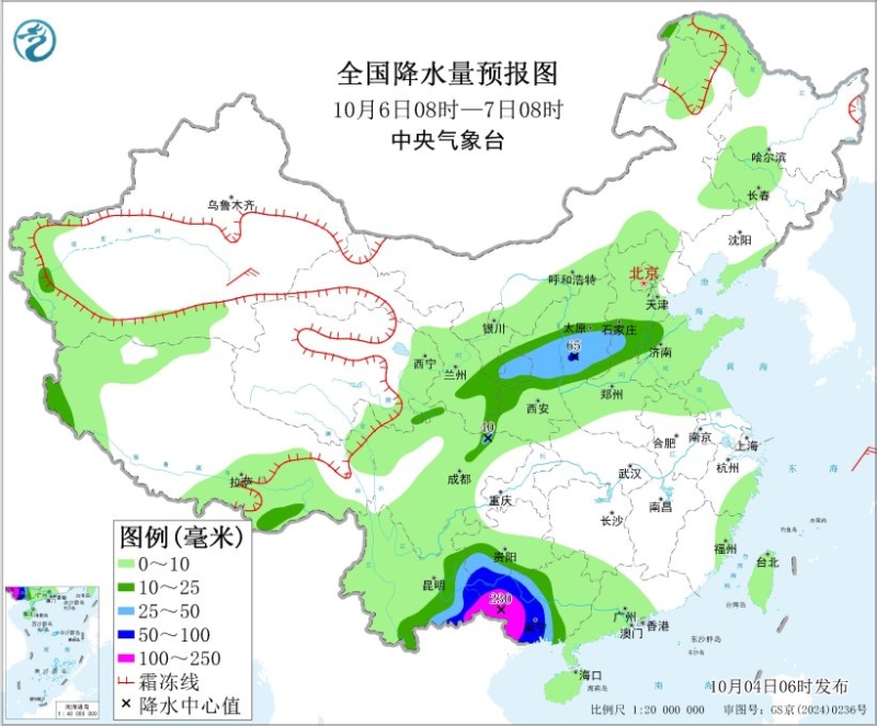 10月6日08時(shí)至7日08時(shí),西藏西部和東南部、甘肅東部、陜西中北部、山西中南部、河北南部、山東西部、四川盆地北部、廣西西部和南部、貴州南部、云南東部等地部分地區(qū)有中到大雨,其中,貴州西南部、云南東南部、廣西西部和南部等地部分地區(qū)有暴雨或大暴雨(100~230毫米)。新疆東部和南疆盆地、甘肅河西、西藏西部、內(nèi)蒙古西部和東部等地部分地區(qū)有4~6級(jí)風(fēng);渤海、黃海大部海域?qū)⒂?~6級(jí)風(fēng)、陣風(fēng)7級(jí),北部灣將有6~7級(jí)風(fēng)、陣風(fēng)8級(jí)。