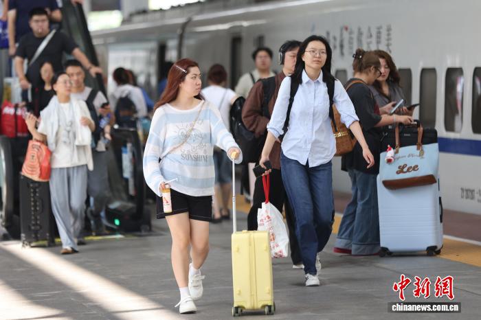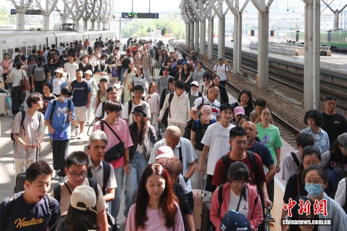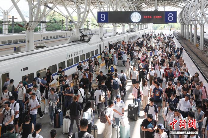 10月8日,江蘇南京,旅客們在火車站出行。當(dāng)日是國慶中秋假期最后一天,長三角鐵路迎來返程客流最高峰。中新社記者 泱波 攝