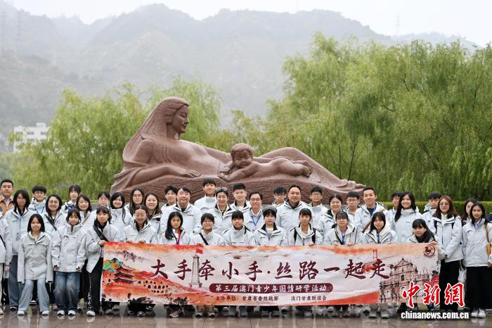 圖為澳門青少年在蘭州黃河母親塑像前合影。中新社記者 九美旦增 攝