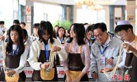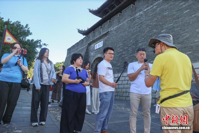 10月15日,江西贛州,兩岸新媒體人在宋代古城墻的建春門旁聆聽導游講解并拍攝視頻素材。中新社記者 劉力鑫 攝