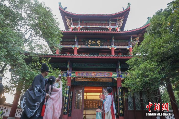 10月15日,江西贛州,兩岸新媒體人身著古裝在郁孤臺參觀游覽。中新社記者 劉力鑫 攝